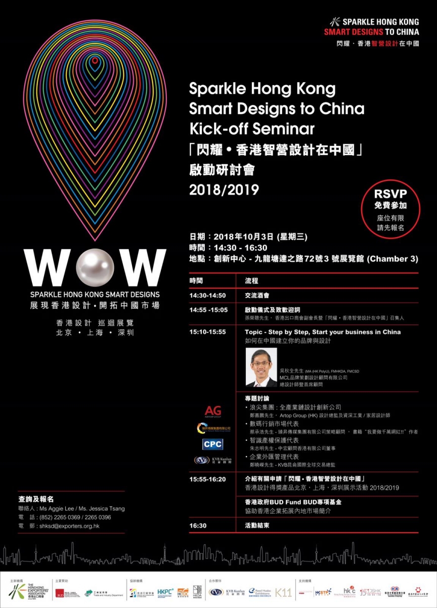第一屆 “閃耀,香港智營設計在中國” 啟動禮及研討會!可以認識不同香港設計師及公司交流。研討會透過在中國市場享譽盛名的成功品牌及設計師分享,深入淺出分享如何在內地建立品牌的成功之道!我們更請來在中國建立品牌的4大要素代表,以討論形式向來賓提供打入中國市場的全方位方法,更請了政府BUD 專員教你如何申請BUD 政府專項基金- 足夠資金助你開拓中國!